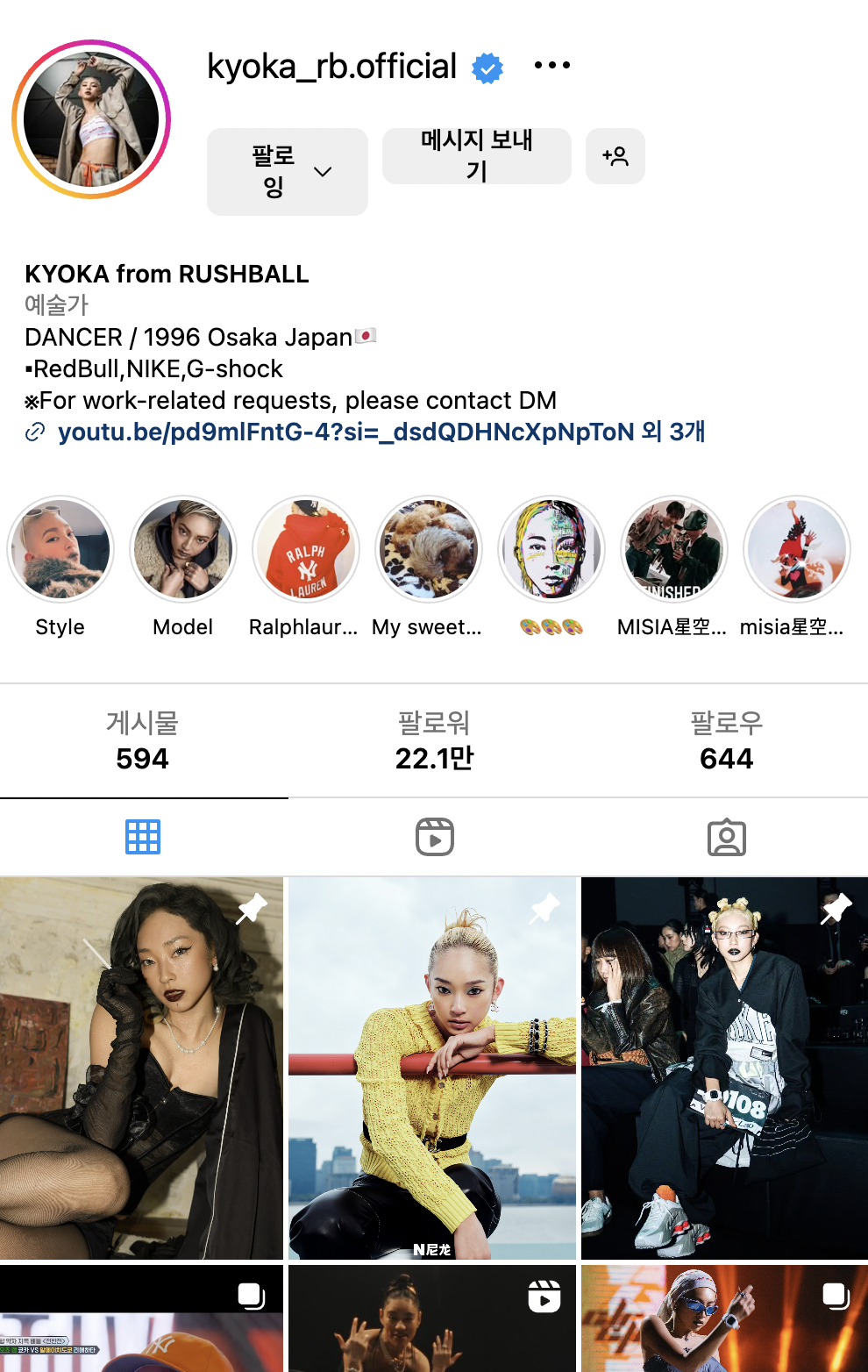무신사 스토어에서 쿄카 인터뷰한 것도 봤는데, 오사카 출신이라는 거랑 RUSHBALL에서 활동하는 모습.. 힙합 댄스를 추게 된 계기랑 힙합 댄스의 매력에 대해 이야기하는 모습도 멋져.